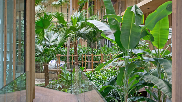 In het centrale atrium van Hotel Jakarta Amsterdam is een subtropische tuin gerealiseerd in samenwerking met Hortus Botanicus Amsterdam. Zij hebben een zorgvuldige selectie gemaakt van bomen, metershoge palmen en planten uit Azië.